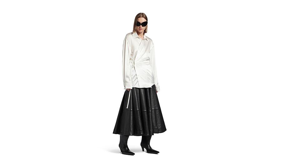 A Balenciaga faz história na indústria como a primeira casa de moda a implementar uma alternativa avançada de seda produzida por bioengenharia, desenvolvida com a startup AMSilk, sediada em Munique. Introduzido através de uma camisa e um vestido-camisa fluidos na coleção prêt-à-porter Primavera 26, o material livre de combustíveis fósseis reflete a aparência da seda tradicional, ao mesmo tempo que oferece maior elasticidade e resistência a rugas.